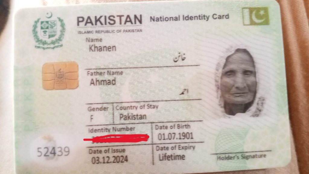 Khanen Ahmad has had her ID renewed four times in total throughout her life. Pakistani authorities requested on-ground verification twice, and her age was successfully verified through old British Raj records. Once through Numberdar Sikandar Hayat and then through his son Numberdar Noubahar Hayat of the same area.